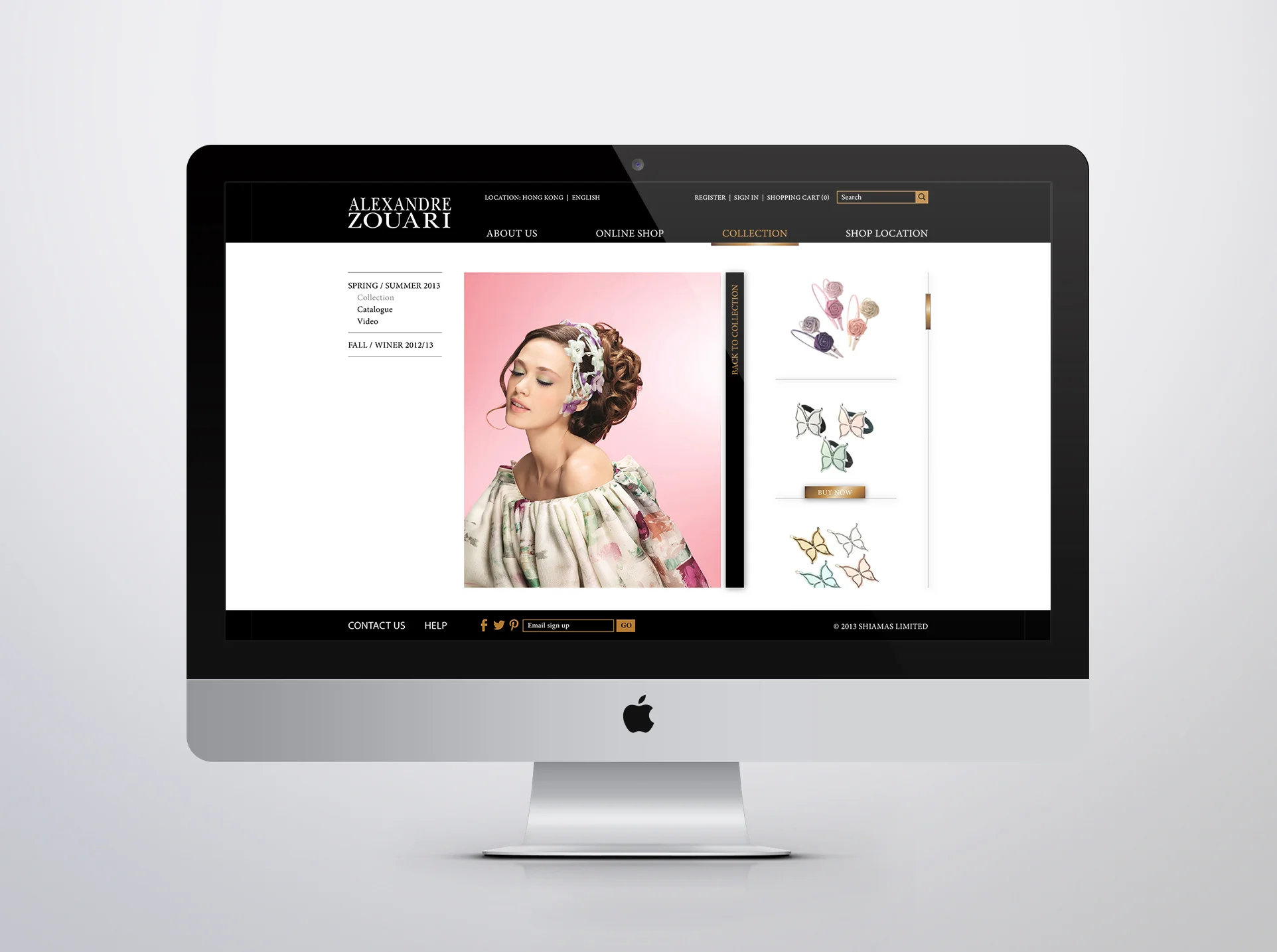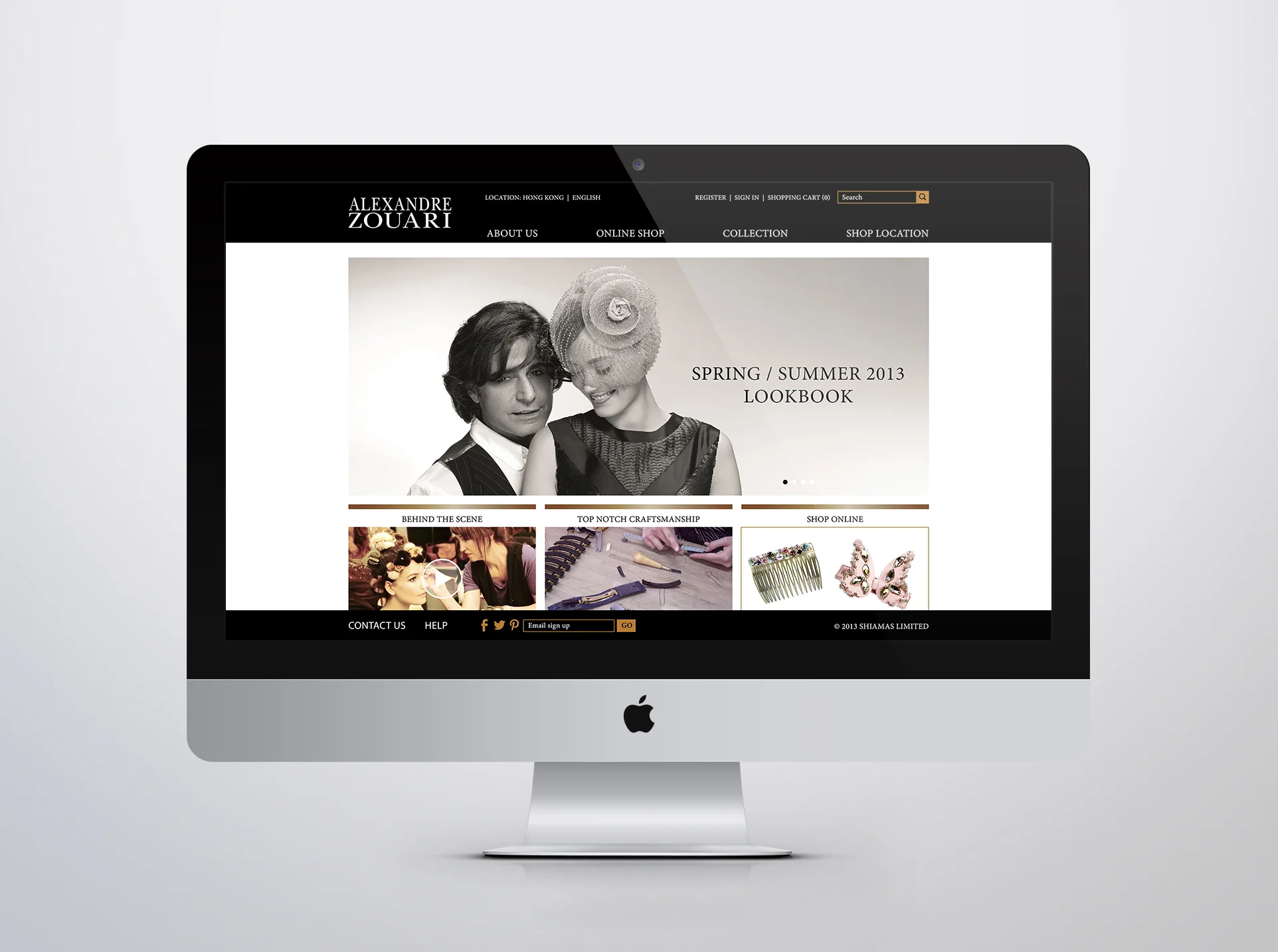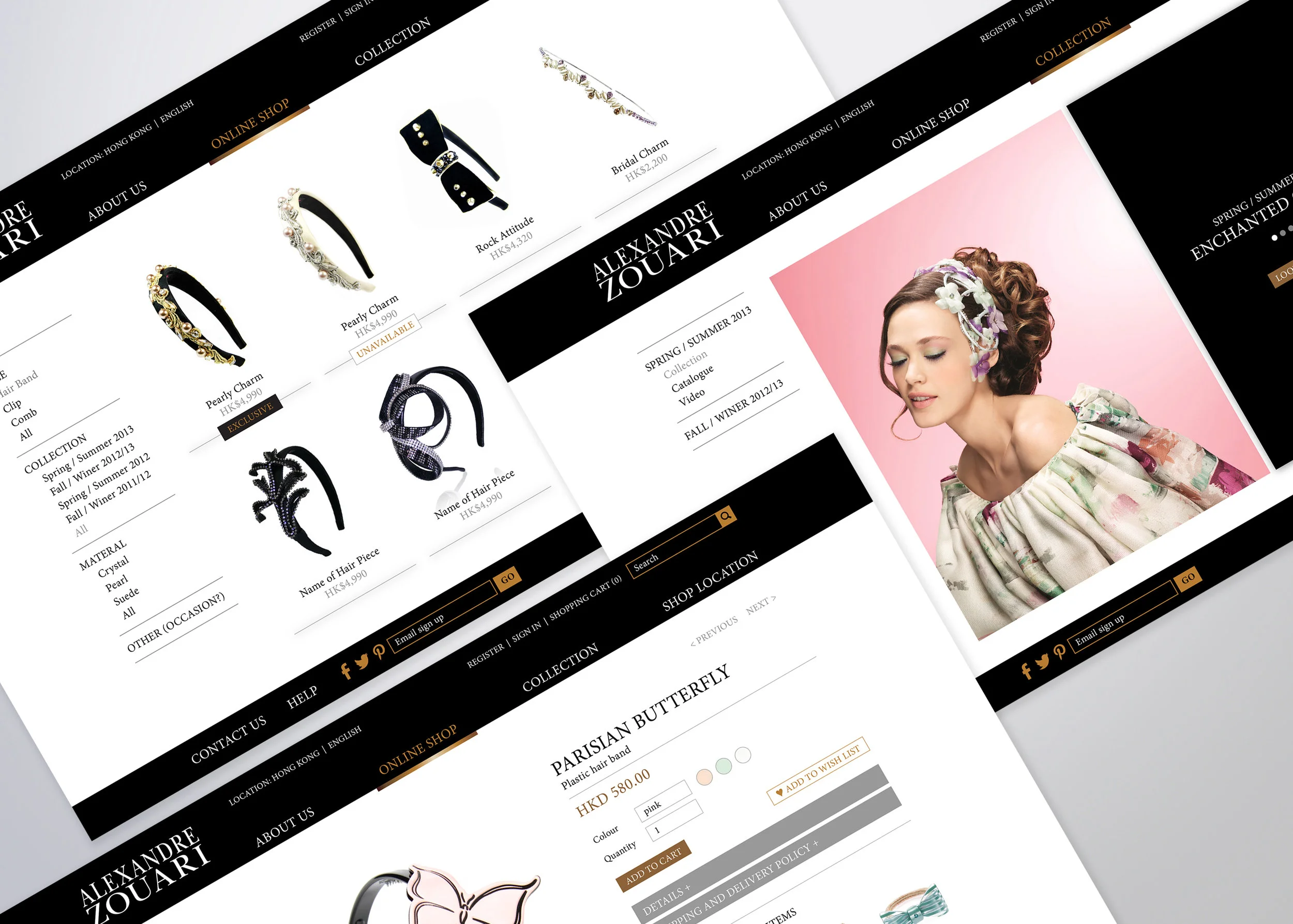 Website and online shop design for Alexandre Zouari, a luxury hair accessory brand from France.