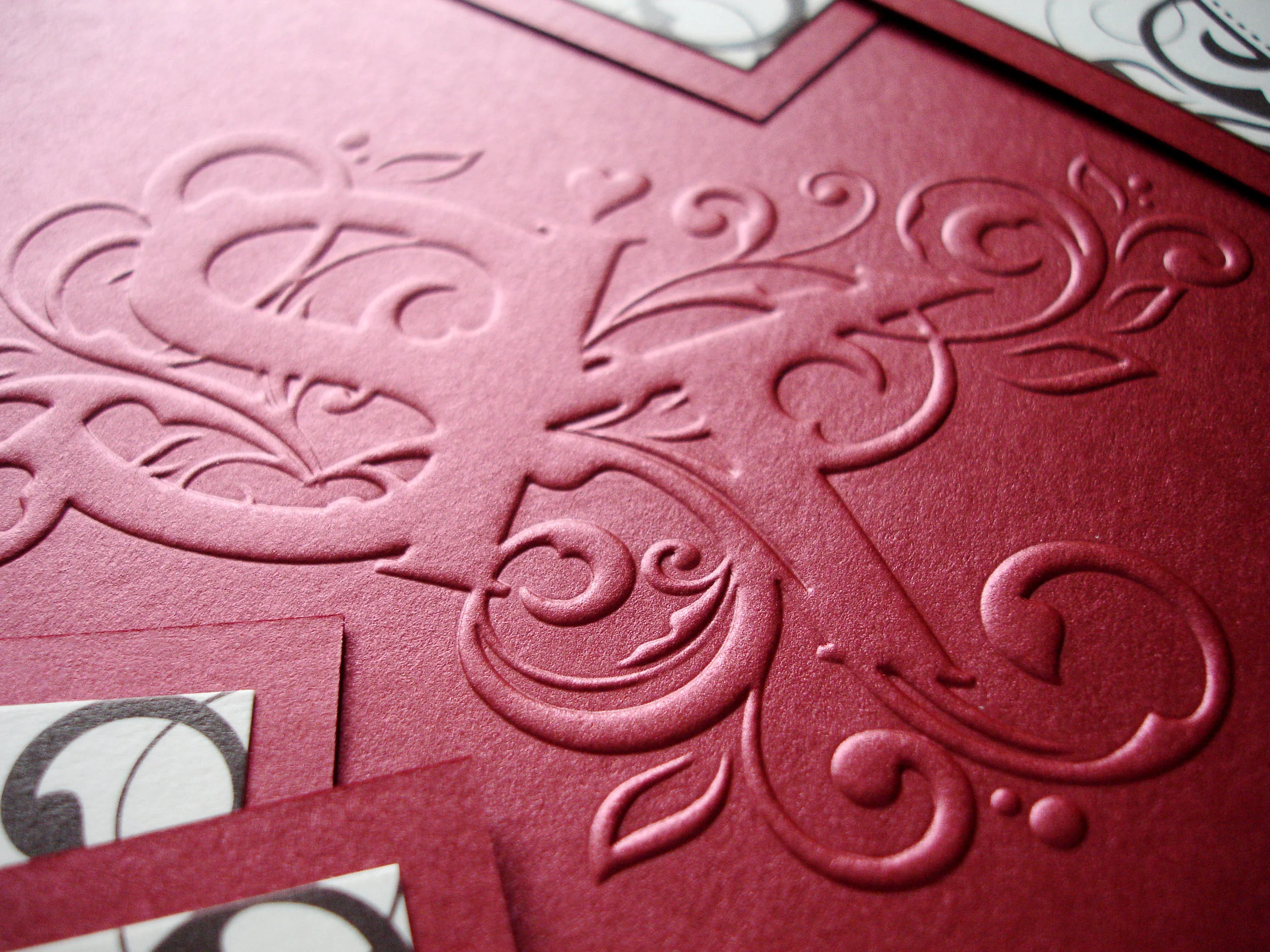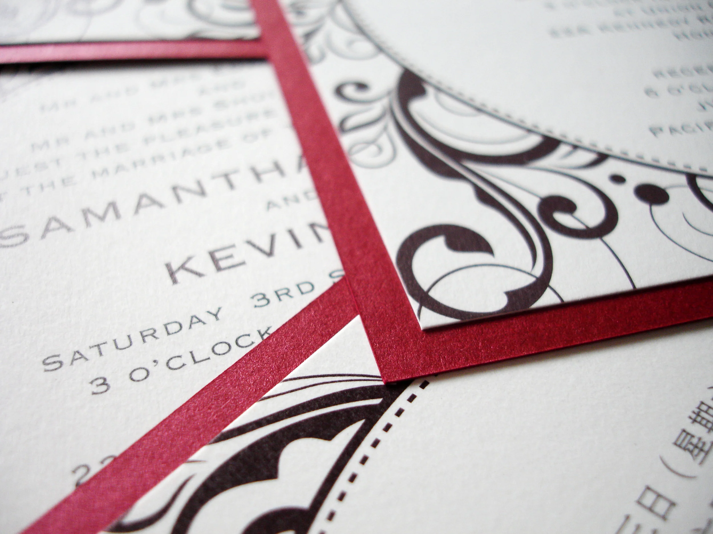 A monogram was especially designed with Samantha & Kevin’s initials. The matching ornamented pattern continues throughout the wedding invitation.